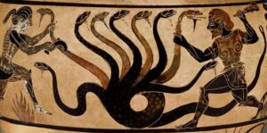 Hercules, the hero of great strength and courage, was called to defeat her. He entered the dark waters and each time he cut off a head, he used fire to cauterize the wound so it would not grow back.